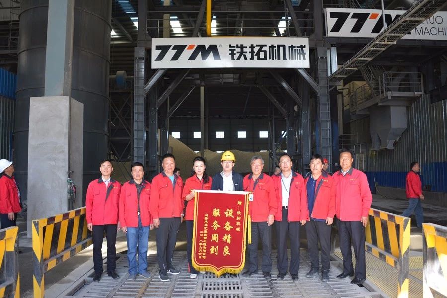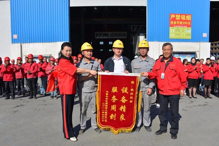剪彩儀式結(jié)束后,隋思玉董事長(zhǎng)親自贈(zèng)予鐵拓機(jī)械“設(shè)備精良,服務(wù)周到”紅色大錦旗,對(duì)鐵拓機(jī)械在項(xiàng)目實(shí)施過程的各項(xiàng)工作給以肯定。