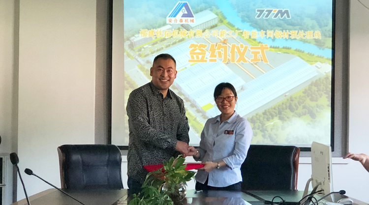11月11日上午,福建鐵拓機(jī)械有限公司與青島安合泰機(jī)械制造有限公司正式簽約,就新工廠智能車間的“鋼板預(yù)處理生產(chǎn)線”項(xiàng)目計(jì)劃達(dá)成共識。